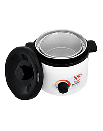 El primer contenedor (izquierda) es para calentar la cera , allí se coloca un colador para que en la segunda olla (derecha) quede filtrada la cera para poder utilizarla nuevamente.